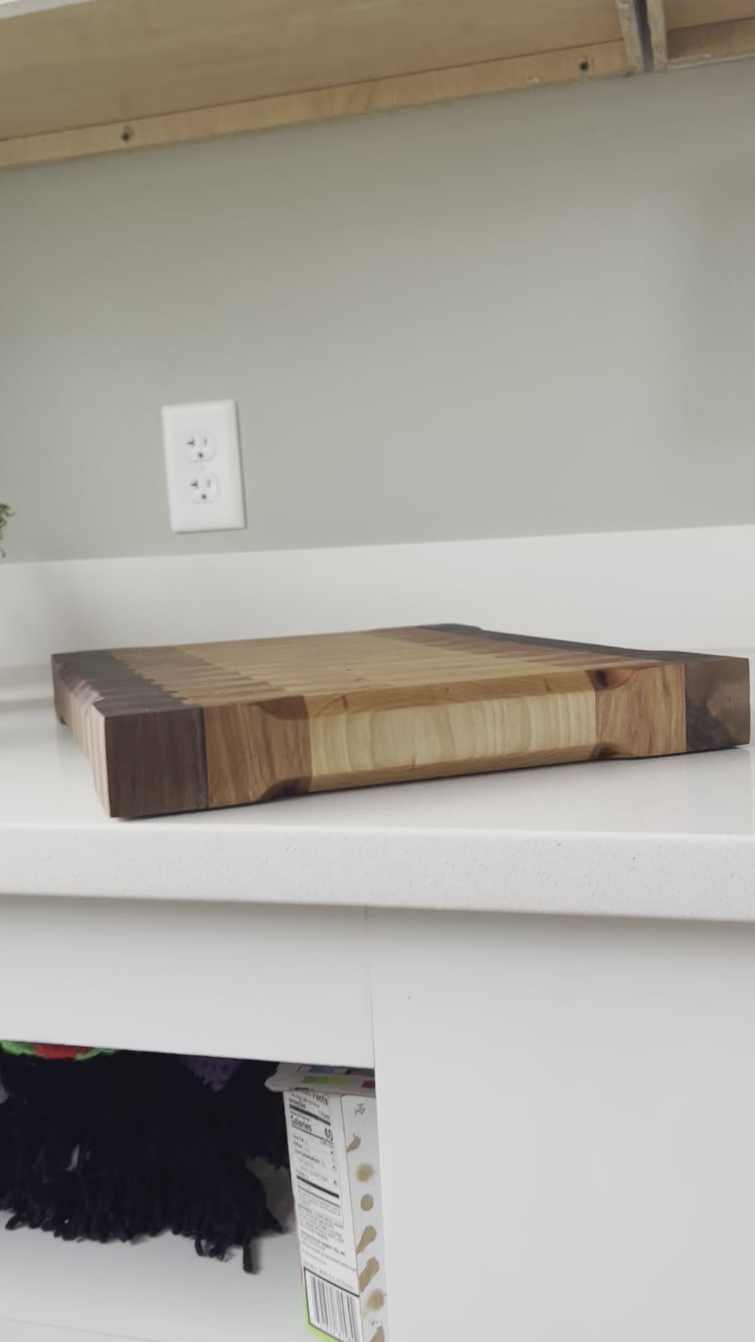 14”x11.5x1.75” end grain cutting board made of Black Walnut, Hard Maple and Red Oak.